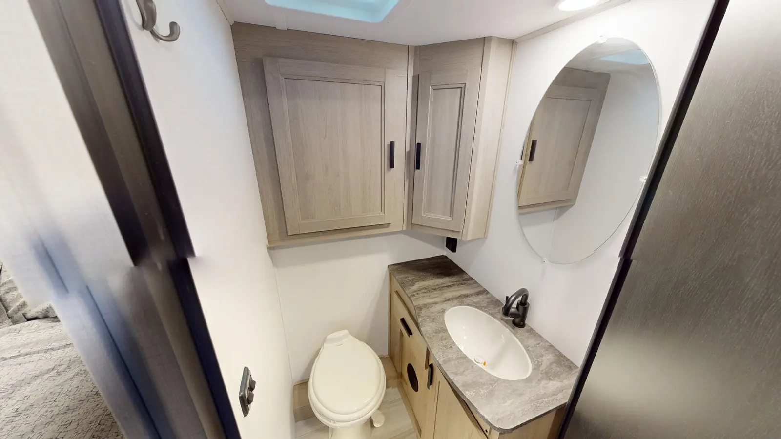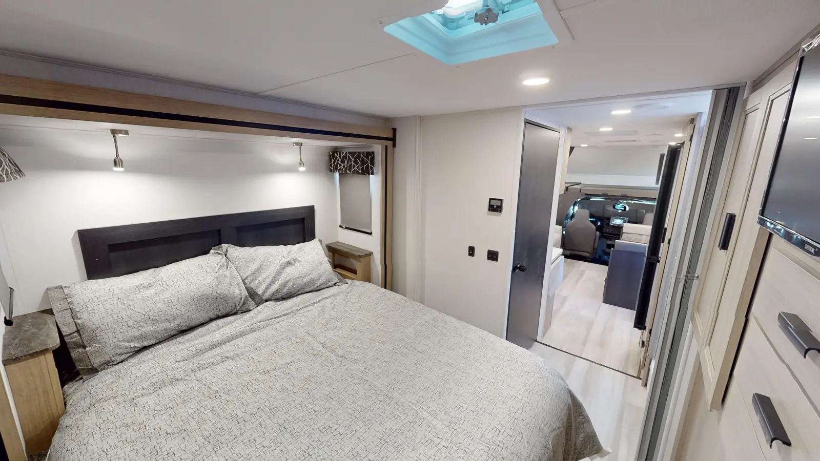 The 2861DS is distinguished by its full outdoor kitchen, which includes a 12V refrigerator, 12V TV, induction burner, and sink with its own dedicated gray tank. Inside, there's a 60" x 80" mattress in the cab over bunk. There's a large couch and booth dinette, plus a well-equipped kitchen that includes a 12V 10 cu ft refrigerator. Past the split full bathroom, the rear master bedroom features large windows, a walkaround queen bed, and large wardrobe closet. Two slideouts ensure plenty of space.
