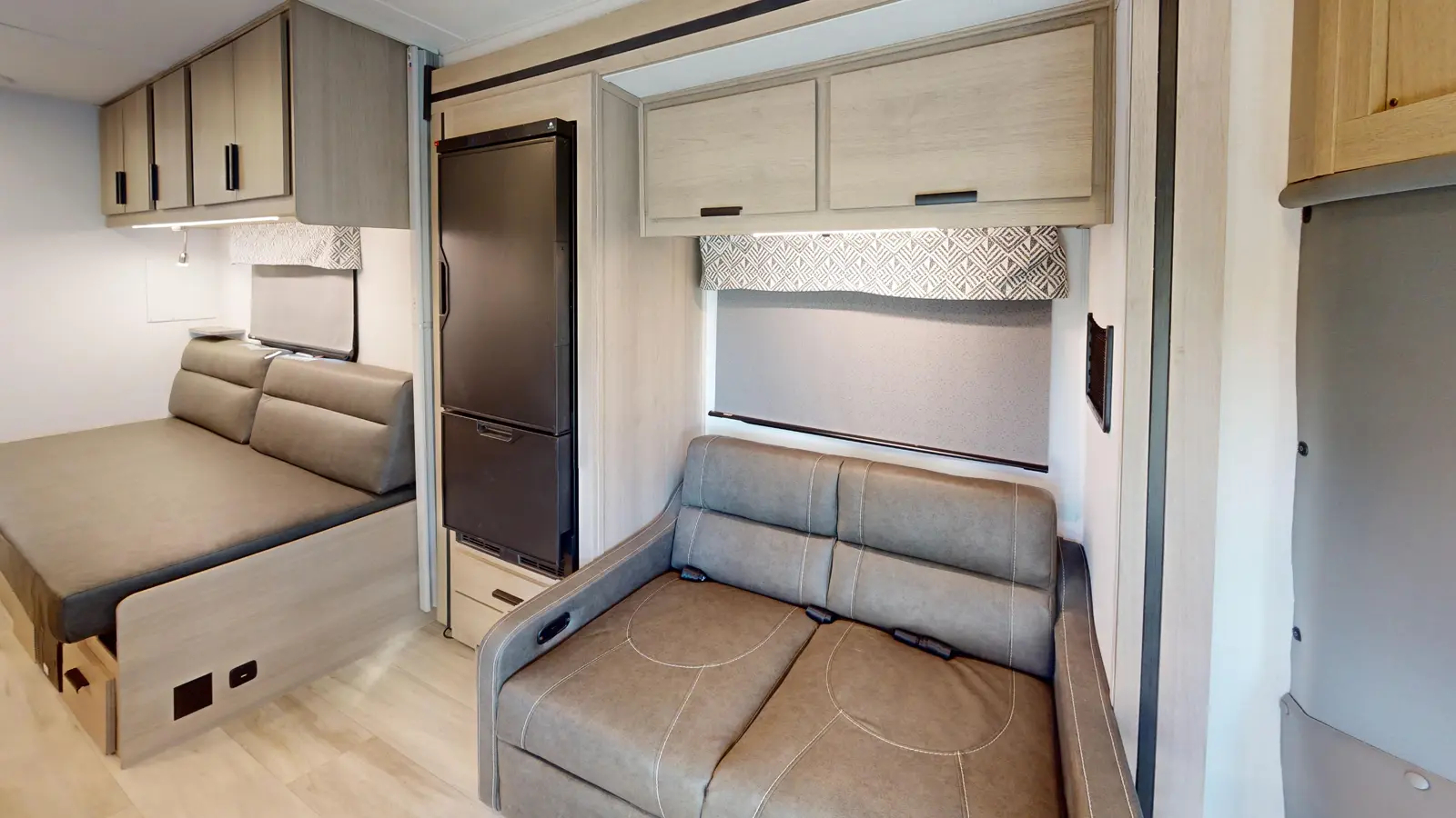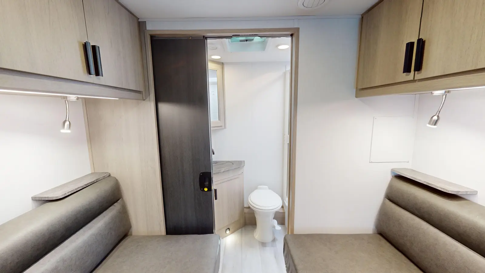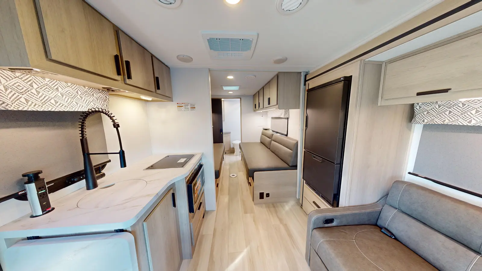 Trips across country or state are made comfortable in this motorhome for two. This unique floorplan features a pair of twin beds that can convert to a queen if you'd rather have one large sleeping area. The full rear bath includes a 24" x 36" shower and a wardrobe to store clean towels, and you'll find plenty of overhead compartments for all your belongings. Each morning you can prepare breakfast on the two burner range, or use the convenient convection microwave.